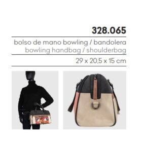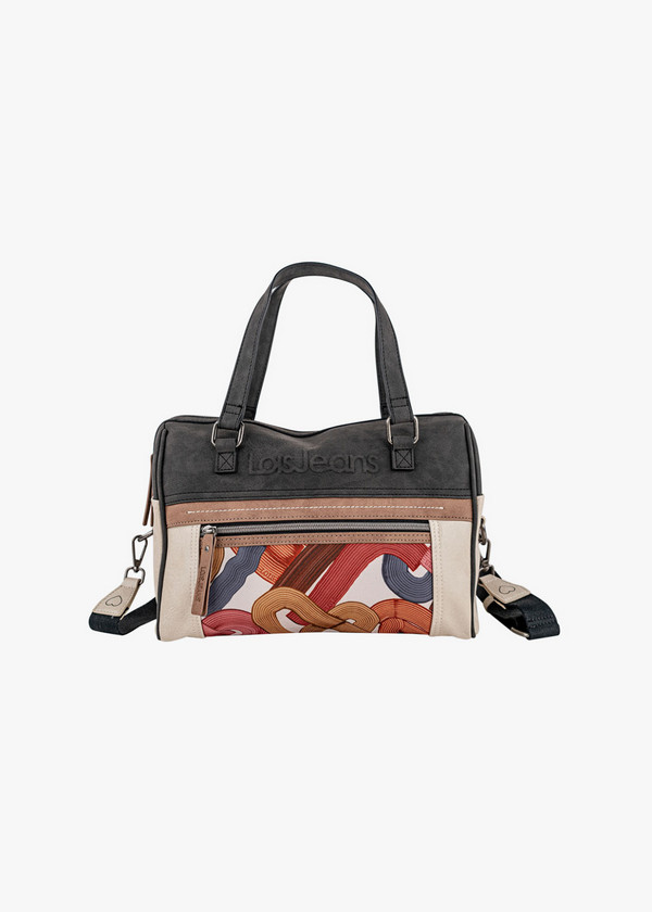 Bolso bowling con diseño multicolor y detalles en contraste negros. Confeccionado en materiales resistentes, combina asas de mano y correa bandolera regulable para mayor comodidad. Su compartimento principal con cierre de cremallera se complementa con un bolsillo frontal estampado y detalles bordados, ofreciendo estilo y practicidad en un solo accesorio. Ideal para el uso diario o para darle un toque moderno a tus looks casuales.