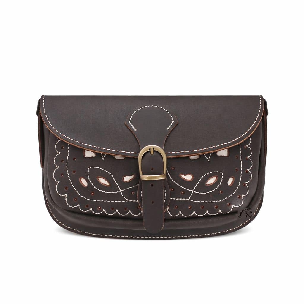 - Bolso rociero realizado en piel de Ubrique, piel 100% española. De color marrón chocolate, detalles y costuras en color blanco. Bolso convertible en bolso de mano y en riñonera, lo puedes ajustar para llevarlo en el cinturón.