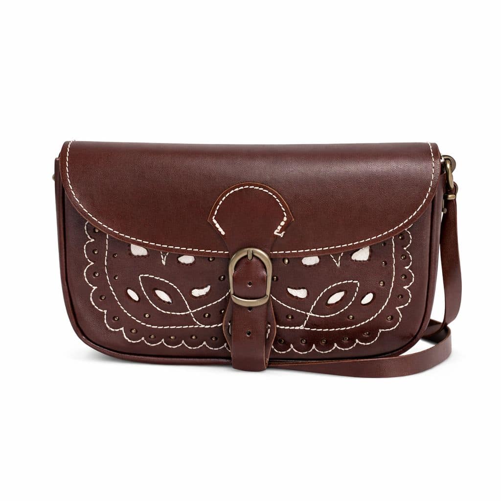 Bolso rociero realizado en piel de Ubrique, piel 100% española. De color marrón, detalles y costuras en color blanco. Bolso convertible en bolso de mano y en riñonera, lo puedes ajustar para llevarlo en el cinturón.