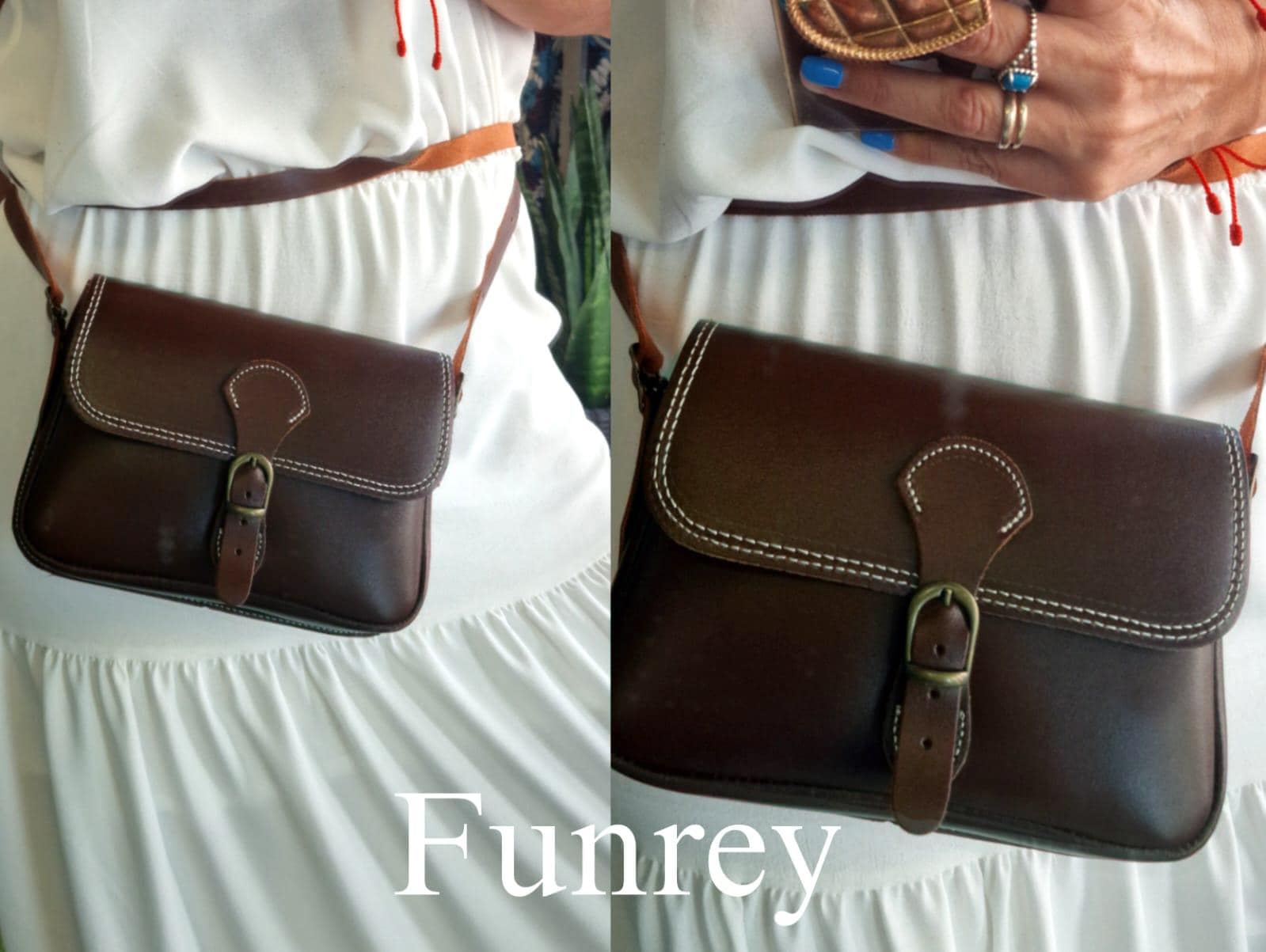 - DISEÑO: Bolso rociero convertible en riñonera de piel marrón. Tiene cabida para llevar móvil, pañuelos, neceser, llaves, etc. Tiene un diseño bordado en color blanco que resalta y le da un toque fino y elegante.