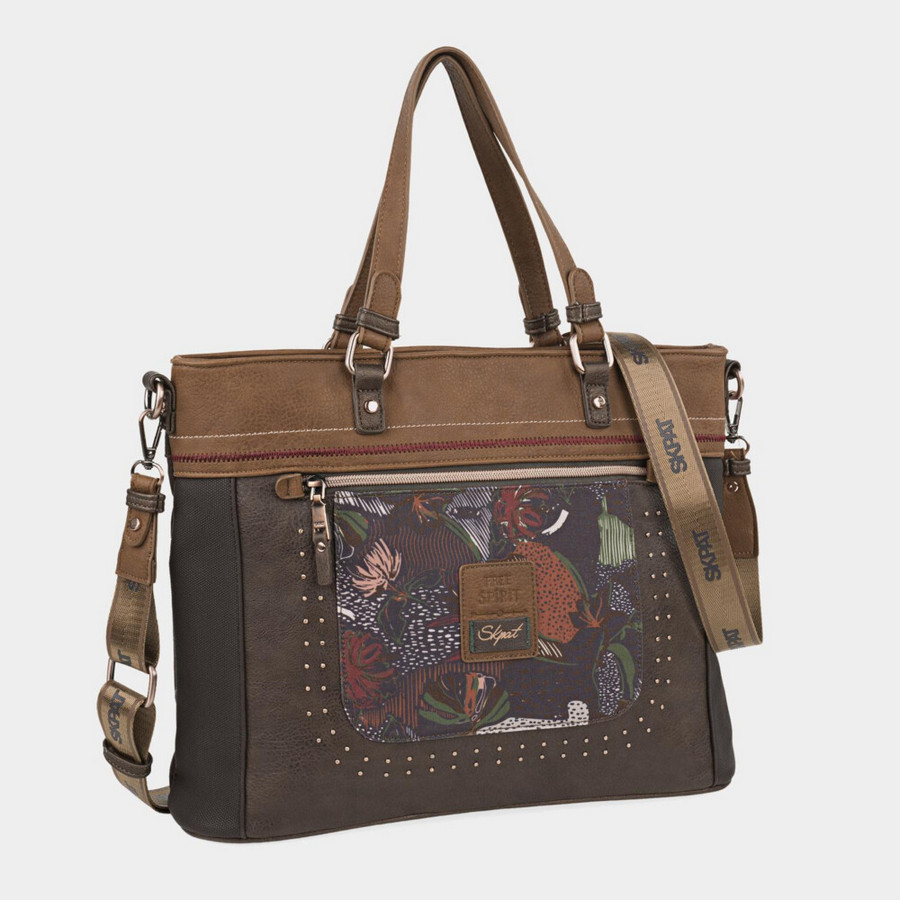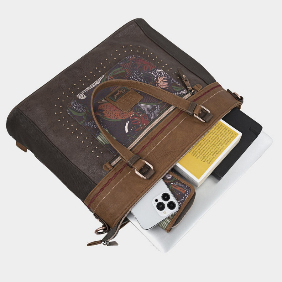 Este bolso tote combina funcionalidad y estilo con un diseño boho-chic que destaca por su mezcla de materiales y su estampado floral en la parte frontal. Fabricado en tonos marrones que aportan calidez y versatilidad, incorpora detalles decorativos como tachuelas metálicas y un parche con relieve que añade personalidad al conjunto.
