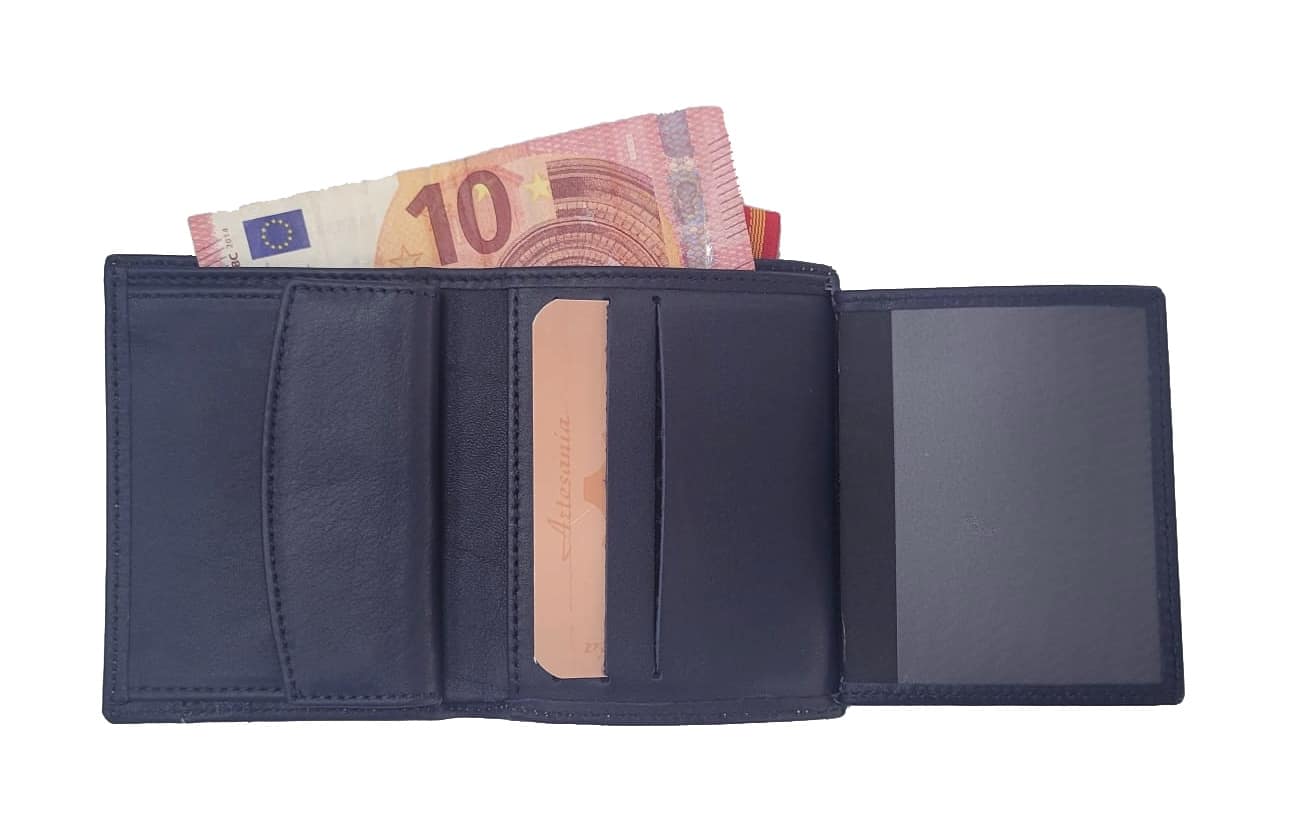 DISEÑO: Cartera fina, elegante y discreta para llevar su acreditación. Compartimentos separados: billetera, monedero y tarjetero, todo en uno.