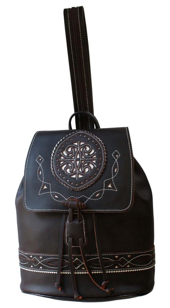 - DISEÑO: Bolso tipo mochila de piel marrón. Tiene cabida para llevar móvil, pañuelos, neceser, llaves, etc.