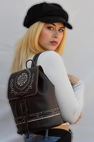 - DISEÑO: Bolso tipo mochila de piel marrón. Tiene cabida para llevar móvil, pañuelos, neceser, llaves, etc. Tiene un diseño bordado en color blanco que resalta y le da un toque fino y elegante.